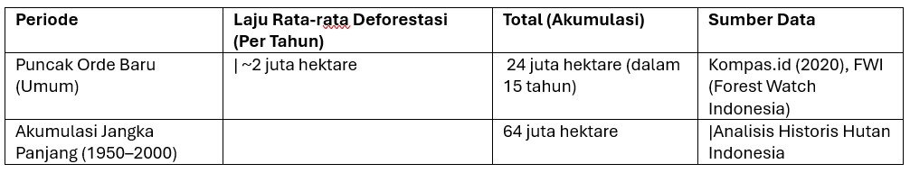 – Laju Terparah: Kompas.id (2020) mencatat bahwa pada masa Orde Baru, hutan Indonesia hilang hingga 2 juta hektare per tahun. Dalam kurun waktu 15 tahun, Indonesia kehilangan 24 juta hektare hutan, setara dua kali luas Pulau Jawa.
