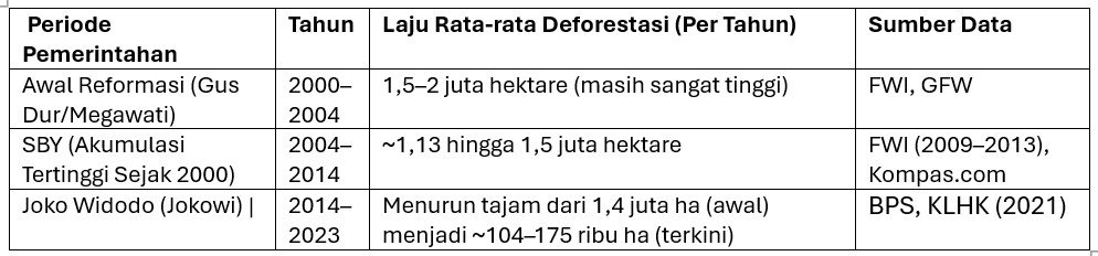 Berikut adalah tinjauan luasan dan persentase deforestasi berdasarkan era pemerintahan, didukung oleh data valid dari lembaga pemerintah dan non-pemerintah.