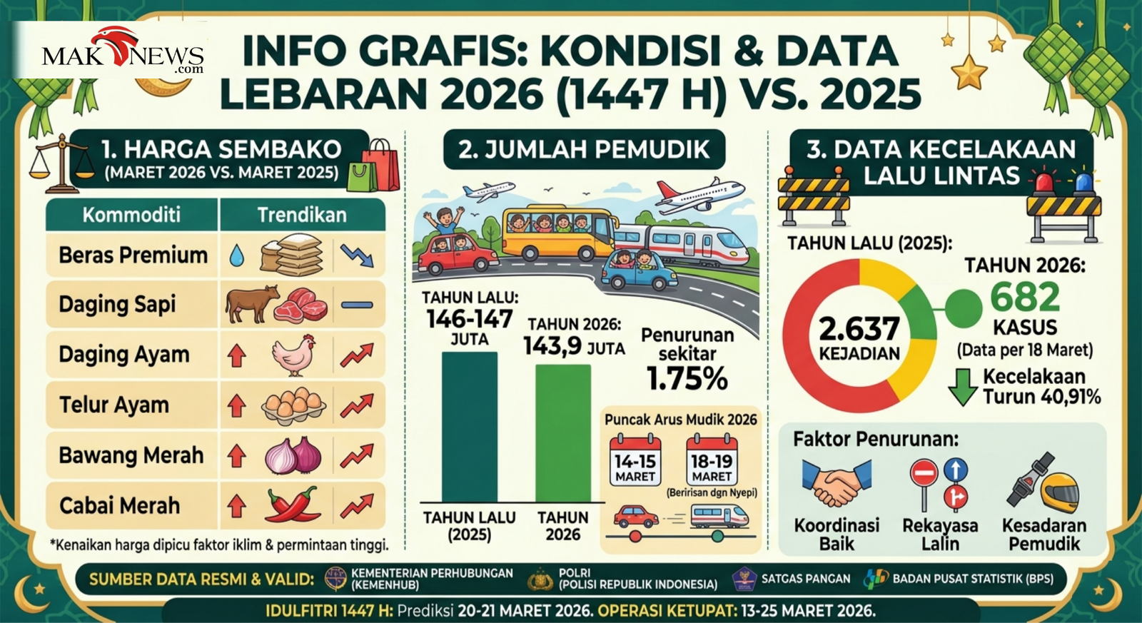 MAKNewscom, Jakarta – Perayaan Idulfitri 1447 H yang jatuh pada Maret 2026 mencatatkan sejumlah tren positif, terutama dalam hal keselamatan transportasi. Meskipun tekanan harga pada beberapa komoditas pangan masih terasa, sinergi pemerintah dalam mengelola arus mudik menunjukkan hasil yang signifikan dibandingkan tahun sebelumnya.
