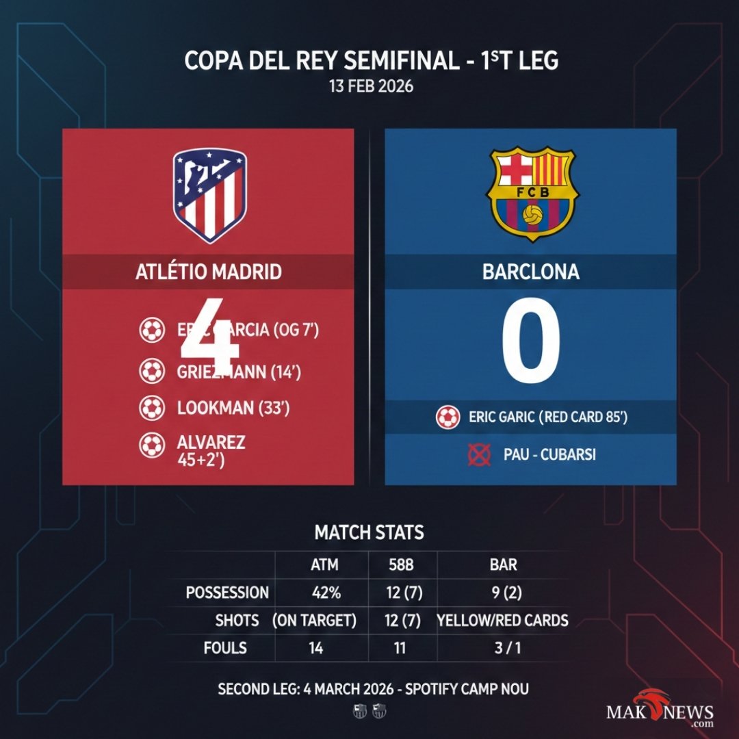 MADRID – Stadion Riyadh Air Metropolitano menjadi saksi bisu runtuhnya pertahanan Barcelona dalam laga leg pertama semifinal Copa del Rey, Jumat (13/2/2026) dini hari WIB. Tim asuhan Diego Simeone tampil tanpa celah, menghujani gawang El Barca dengan empat gol tanpa balas—semuanya tercipta hanya dalam kurun waktu 45 menit pertama.
