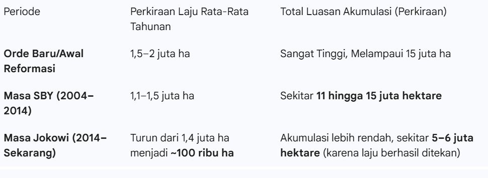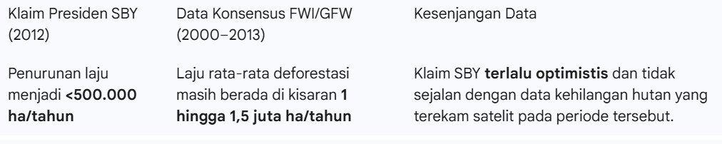 Klaim Presiden SBY pada tahun 2012 berfungsi sebagai pernyataan komitmen politik dan sorotan terhadap langkah-langkah positif seperti Moratorium. Meskipun Moratorium diakui efektif, data menunjukkan bahwa laju deforestasi netto pada masa pemerintahannya masih tinggi dan tidak mencapai angka <500.000 ha/tahun seperti yang diklaim. Tingginya laju deforestasi yang berlangsung selama satu dekade penuh inilah yang secara akumulatif menghasilkan luasan hutan yang hilang paling besar di antara periode Reformasi pasca-tahun 2000.***